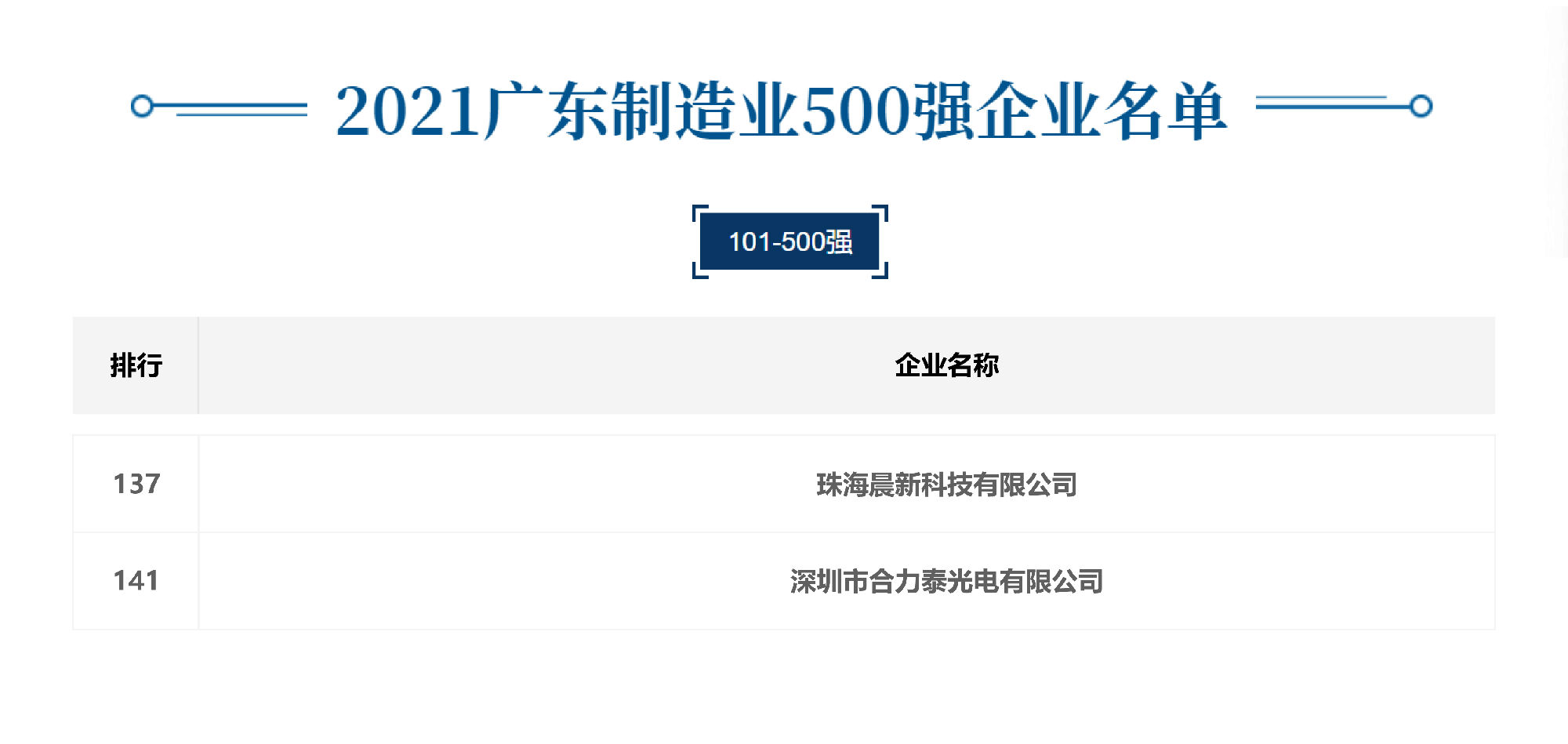 近期,廣東省制造業(yè)協(xié)會(huì)、廣東省發(fā)展和改革研究院等機(jī)構(gòu)聯(lián)合發(fā)布了2021廣東省制造業(yè)500強(qiáng)企業(yè)名單,合力泰旗下珠海晨新科技有限公司、深圳市合力泰光電有限公司榮登榜單,分別位列第137名、第141名。